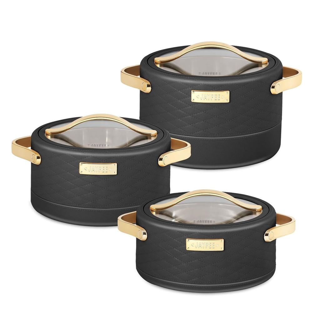 TABAKH Luxura Klass Inner Stainless Steel Serving Casserole Set of 3 Elegance Unique Design PU Insulated 100% Food Grade with Lockable Lid, Chrome Plated Handle Hot Case | 1500, 2000, 2500 ml